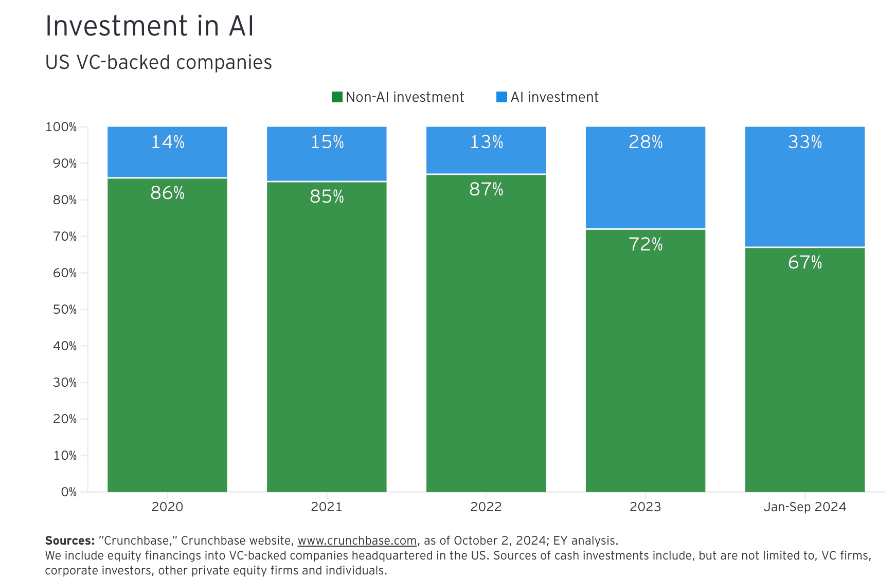 The Cartel has positioned Artificial Intelligence (AI) as its primary narrative tool for maintaining market control. During the first three quarters of 2024, investments in AI-focused AI-focused ventures captured 33% of all US VC funding through Q3 2024, up from 14% in 2020. By establishing themselves as AI "gatekeepers," dominant firms have created artificial scarcity in access to perceived premium deals.